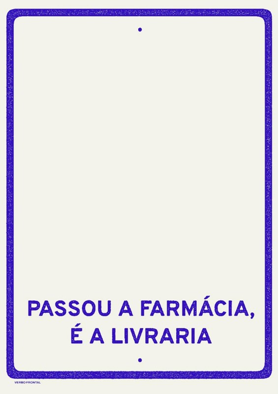 Poster “Passou a Farmácia é a Livraria”, do poeta visual Verbo Frontal, em tamanho 30 x 42 cm (A3). Impressão digital artesanal (baixa tiragem) a jato de tinta em ciano e magenta sobre papel pólen 90g.